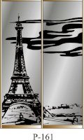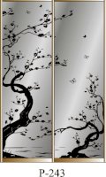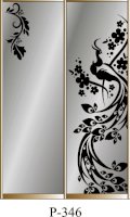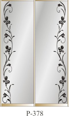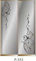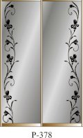 Данное изображение представлено в следующих цветах: корпус - Дуб Сонома, фасады - зеркало с пескоструйным рисунком, рамка двери и треки - Серебро матовое.
