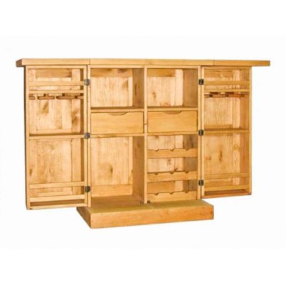 Многофункциональный готовый бар с вместительными отделениями для хранения посуды и напитков и широкой барной стойкой. При этом, он весьма компактный и не займет много места в собранном виде. При открытых дверях ширина барной стойки составляет 169 см. Торцевые части столешницы и крыльев (толщиной 4 см) укреплены поперечными вставками. Внутри бара размещены несколько полок, два ящика, полки для хранения бутылок. В дверцы сверху встроены kit-бары для хранения бокалов; ширина дверцы 40 см.
