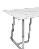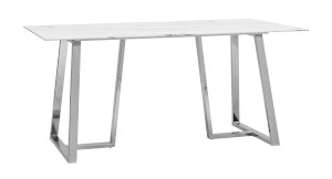 Обеденный стол с красивой стеклянной столешницей белого цвета с рисунком под мрамор. Красивая столешница гармонирует с металлическими ножками оригинальной формы. Такое сочетание смотрится эффектно в любом интерьере. Эта модель подойдет для большой семьи или в дом, где часто бывают гости. Габариты и форма стола позволяют свободно разместить 6-8 человек. Основание стола покрыто порошковой краской и крепится к плите МДФ с обратной стороны стеклянной столешницы. В основании ножек – подпятники для предотвращения царапин на полу. По высоте не регулируются.