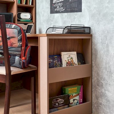 Увеличить площадь рабочего места для размещения книг, рабочих тетрадей и техники можно используя дополнительную консоль к модулю Nature 84 Cтол письменный. С внешней стороны приставного стола имеется дополнительная ниша для хранения. Угловой стол можно установить с любой стороны письменного стола, образуя тот угол, который подразумевает планировка комнаты. Ширину стола можно увеличить или уменьшить на 150 мм с шагом в 1 мм.