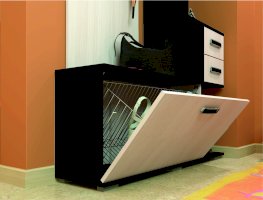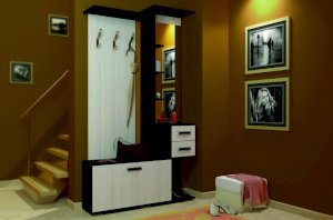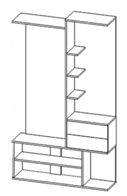 Состоит из полки с крючками, тумбы.