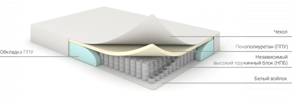 В составе матраса 2 слоя: высококачественный пенополиуретан - 3 см(ППУ ST) и блок независимых пружин - 14 см (НПБ). Увеличенная высота НПБ, по сравнению с матрасом "Супер Комфорт", позволяет наилучшим образом распределить нагрузку, благодаря чему отдых на матрасе можно смело приравнять ко сну на полноценной кровати.