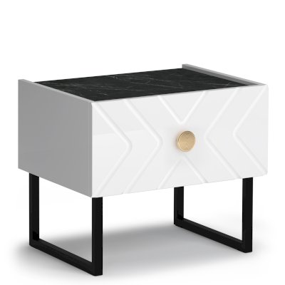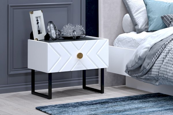Модель оснащена выдвижным ящиком на направляющих скрытого типа. Высокие металлические опоры делают мебель практичной, уборка в труднодоступных местах становится гораздо проще.