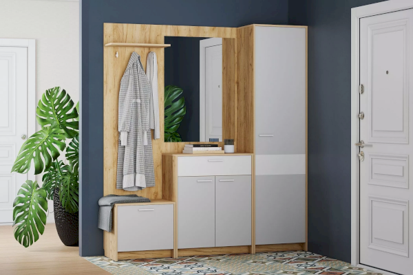Шкаф оснащен выдвижной штангой, на которую удобно повесить верхнюю одежду на вешалках, а также отдельной полкой для размещения головных уборов и прочих вещей. Шкаф может быть собран как на правую, так и на левую стороны. Дополните шкаф тумбой и зеркалом из одноименной коллекции, чтобы оптимизировать место хранения в прихожей и создать особо гармоничную атмосферу!