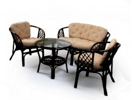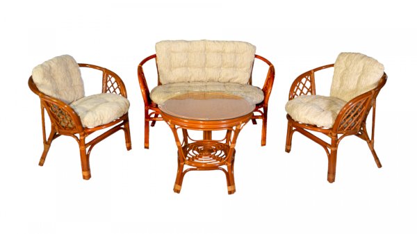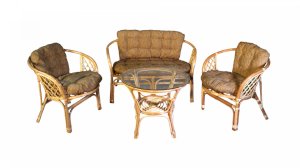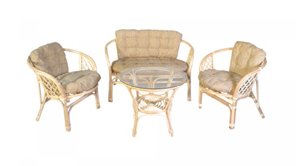 Комплект из натурального ротанга, состоящий из дивана, двух кресел и круглого столика со стеклом.