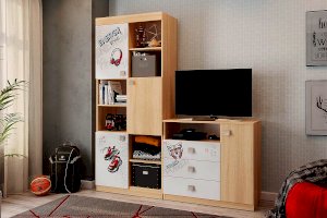 Стеллаж с открытыми и закрытыми полками идеально подойдет для книг, игрушек и мелочей. Эффектный принтерный рисунок на фасадах выдержан в общем стилистическом решении. Рисунок устойчив к истиранию и ультрафиолету. Детская «Энерджи»- все, что нужно для современного подростка!